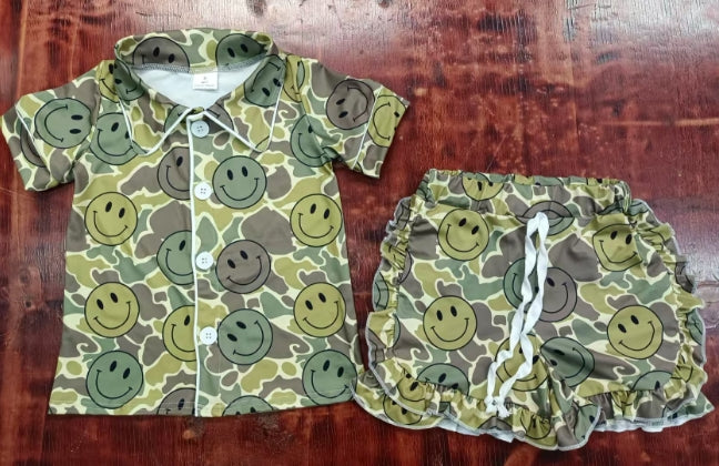 Preorder moq 5 Baby Girls Short Sleeves Green Camo Smiles Button Top Ruffle Short Pajamas Set