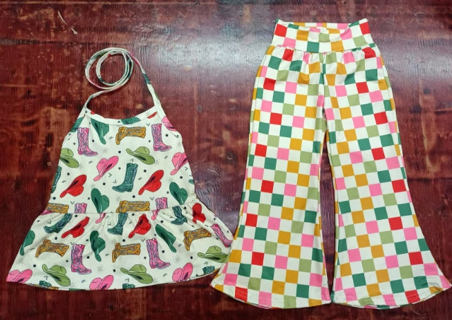 Preorder moq 5 Baby Girls Strap Colorful Hats Boots Tunic Plaid Bell Bottom Pant Set