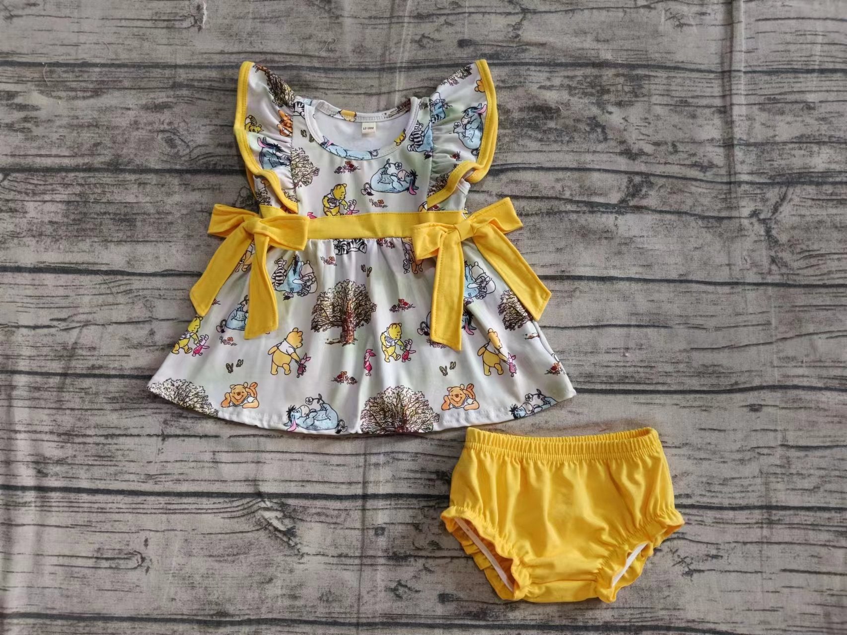 Preorder moq 5 Baby Girls Yellow Flutter Sleeves Bows Cartoon Bears Tunic Bummies Set