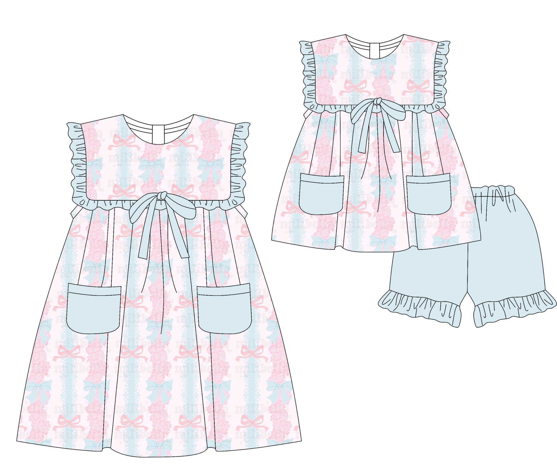 Preorder moq 5 Custom Baby Girls Pink Blue Bows Pockets Tunic Ruffle Short Set Knee Length Dresses