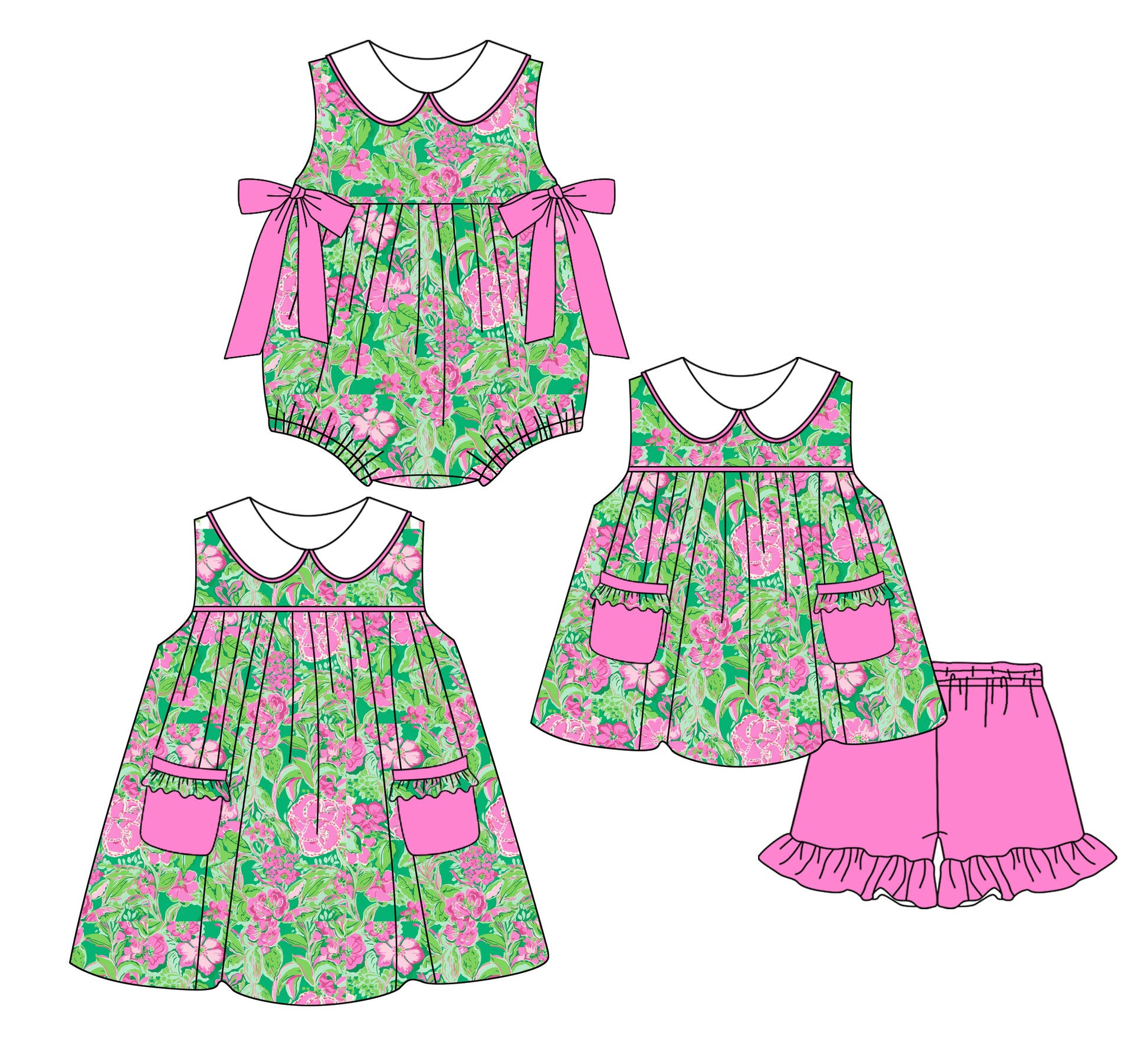 Preorder moq 5 Custom Baby Girls Sleeveless Watercolor Floral Pockets Tunic Ruffle Short Set Knee Length Dress And Rompers