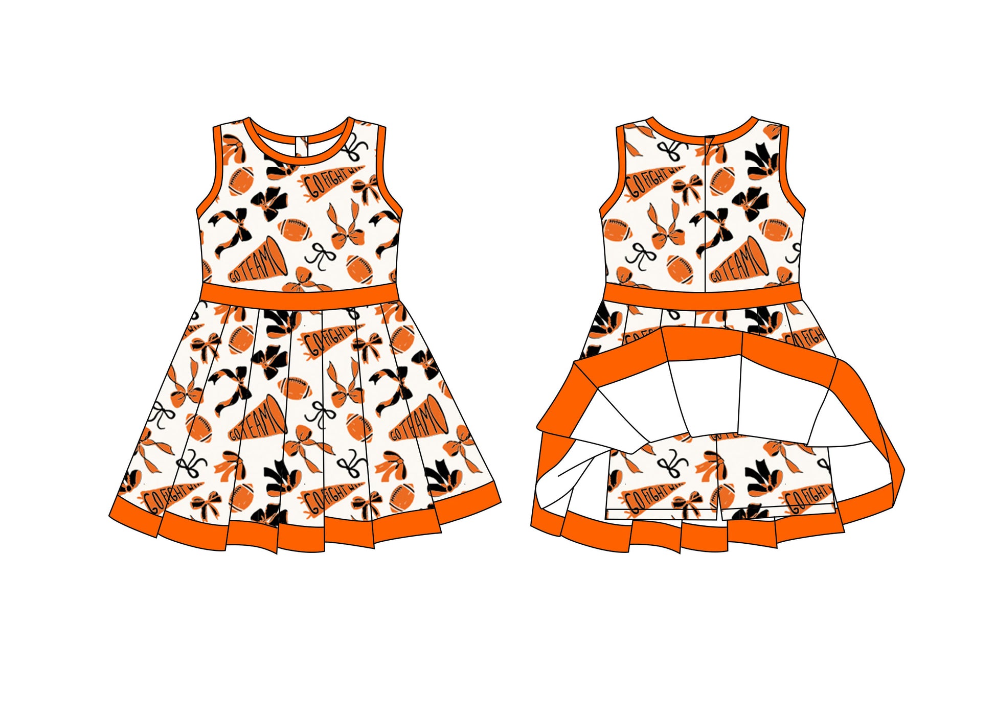 Preorder moq 8 Baby Girls Orange Black Bows Footballs Back Zip Shorts Team Ruffle Knee Length Dress