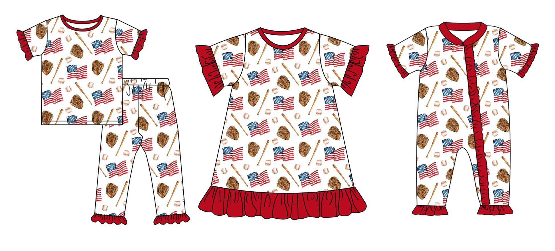 Preorder(moq 5 each)Sibling Baby Girls Red Baseball Flags Romper Dress Pajamas Sets