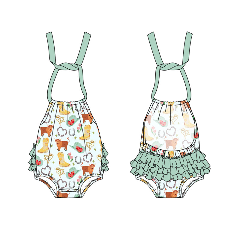 Preorder(moq 5)Baby Infant Girls Aqua Strap Highland Cows Hats Bubble Ruffle Rompers