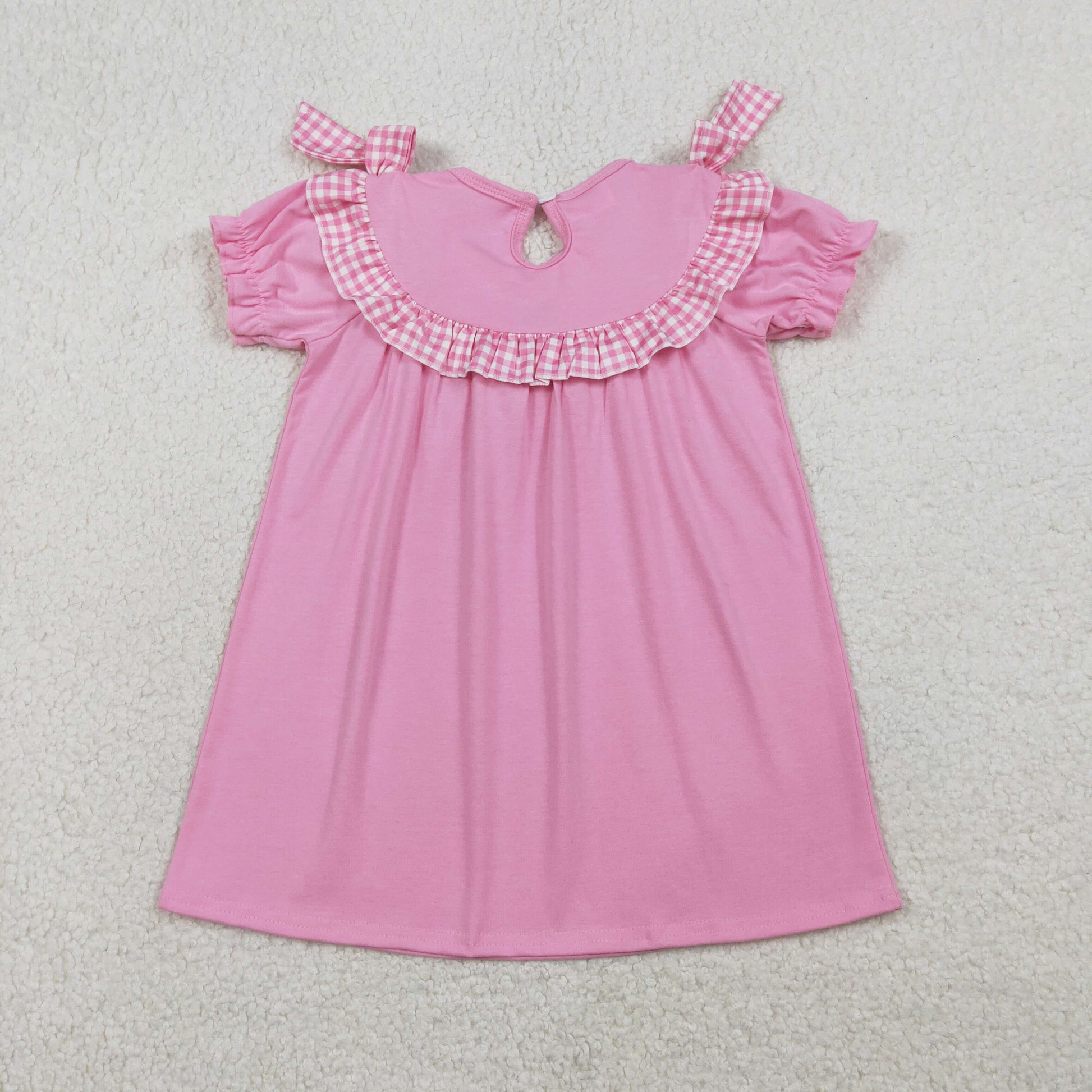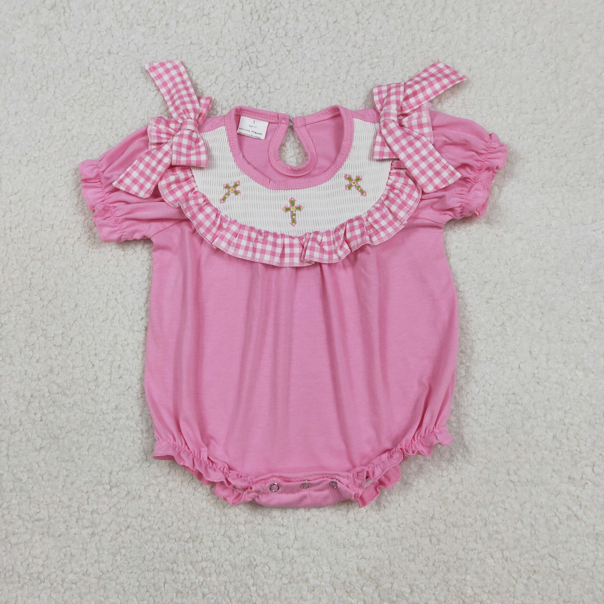 Sibling Smocked Crosses Baby Girls Pink Short Sleeve Easter Knee Length Dress Ruffle Rompers