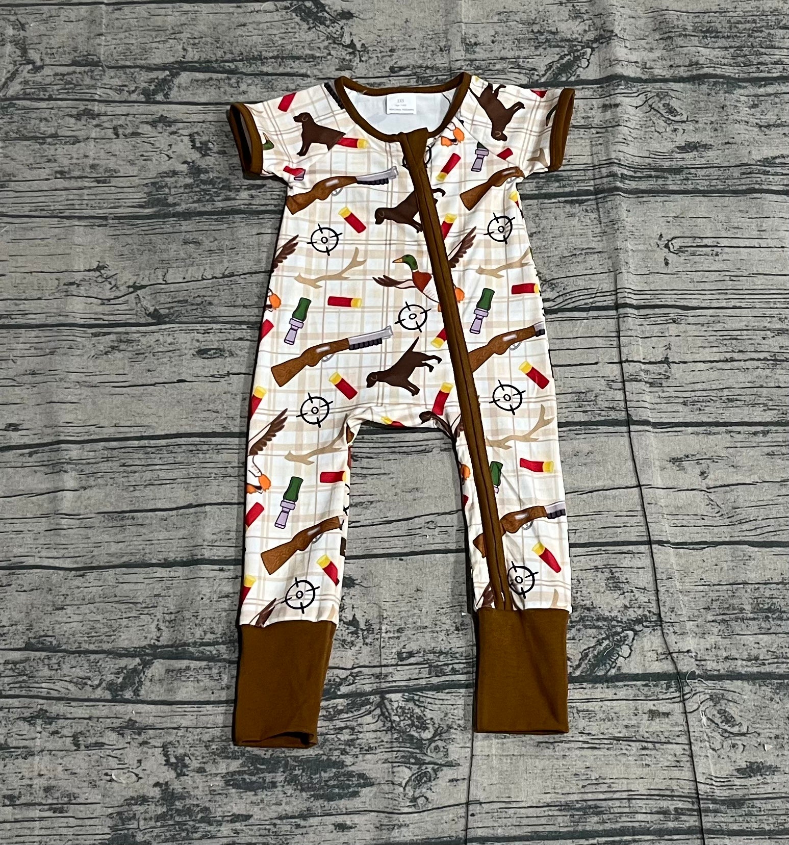 Baby Boys Khaki Checked Dogs Ducks Hunting Two Way Zip Convertible Rompers Preorder